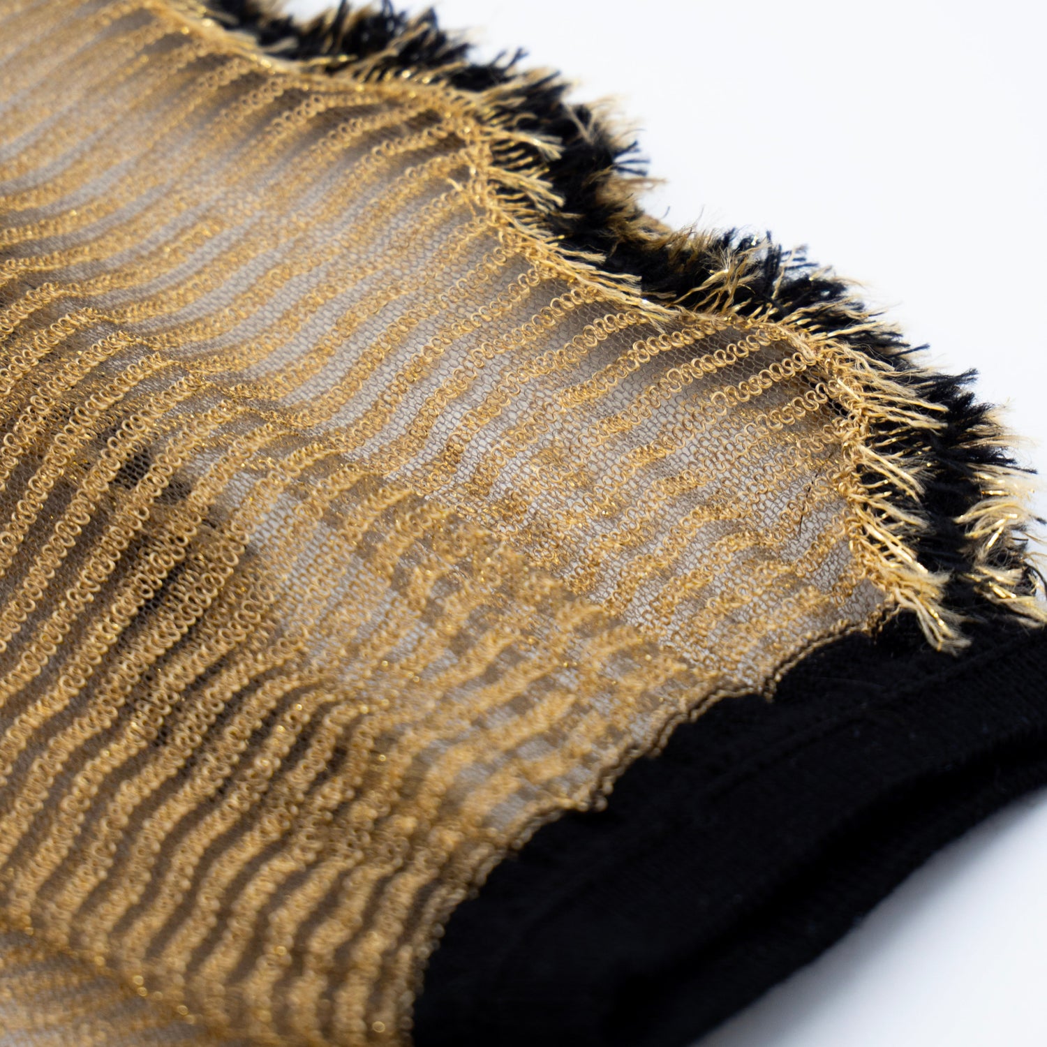 Frangia Doree 靈感源自威尼斯狂歡節的華麗服裝,黑色基調鑲嵌金色閃光,搭配流蘇邊飾,詮釋復古奢華的美學。透明織紋與金光交織,與優雅造型相得益彰。