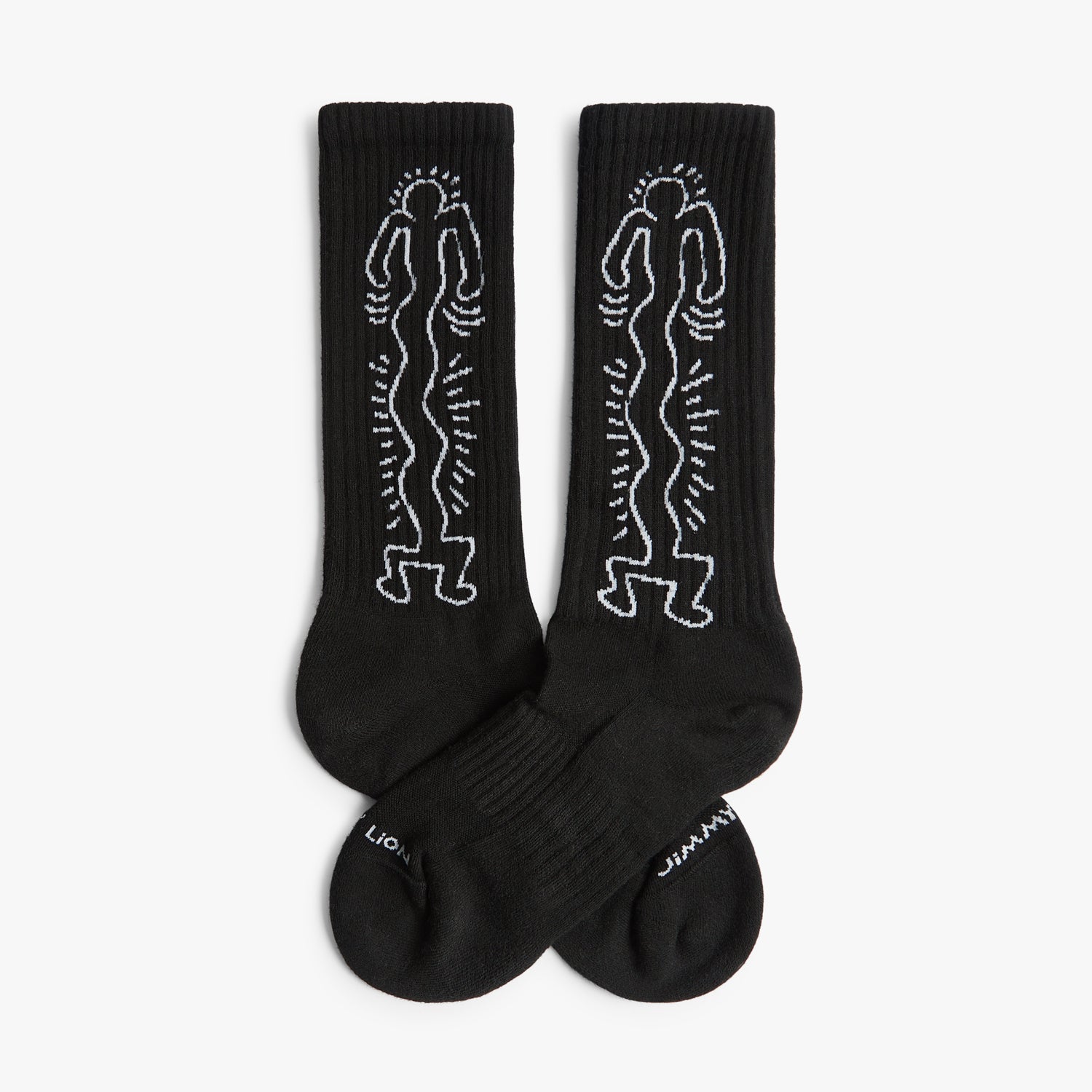 黑色運動風格的襪子,印有 Keith Haring 以白色「跳舞」的標誌性修長人形輪廓。