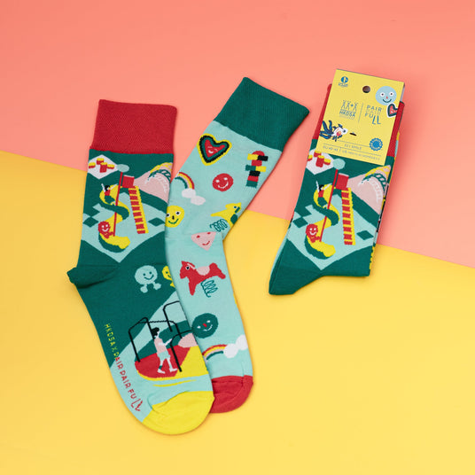 屋邨遊樂場是我們幾代人的集體童年回億,在唐氏綜合症朋友的眼中,這裡則是一個太空遊樂場。滑梯變成了火箭發射台,鞦韆是漂浮在宇宙中的太空船。這款襪子以繽紛圖案,將遊樂場變成了一個探索宇宙的奇幻基地。