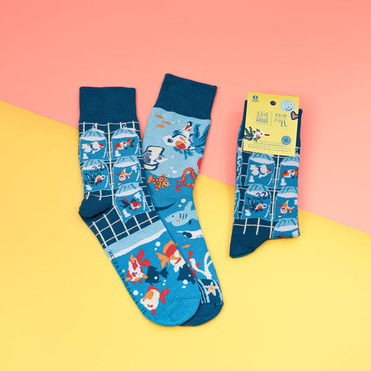 街道就像一條波光粼粼的藍色河流般流淌著。這款襪子設計捕捉了金魚市場異想天開的魅力,以鮮豔的色彩和流動的圖案,將它變成一個奇幻的海洋天堂。