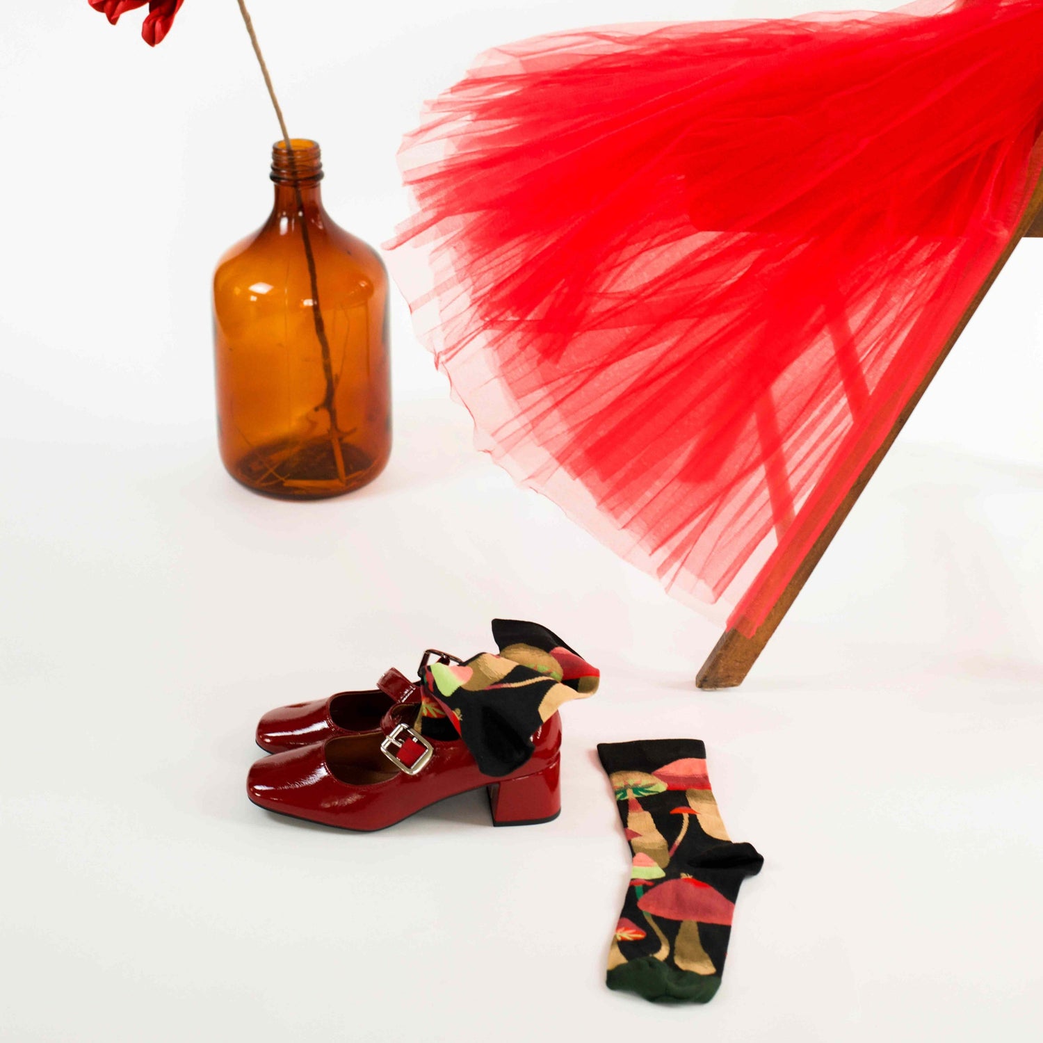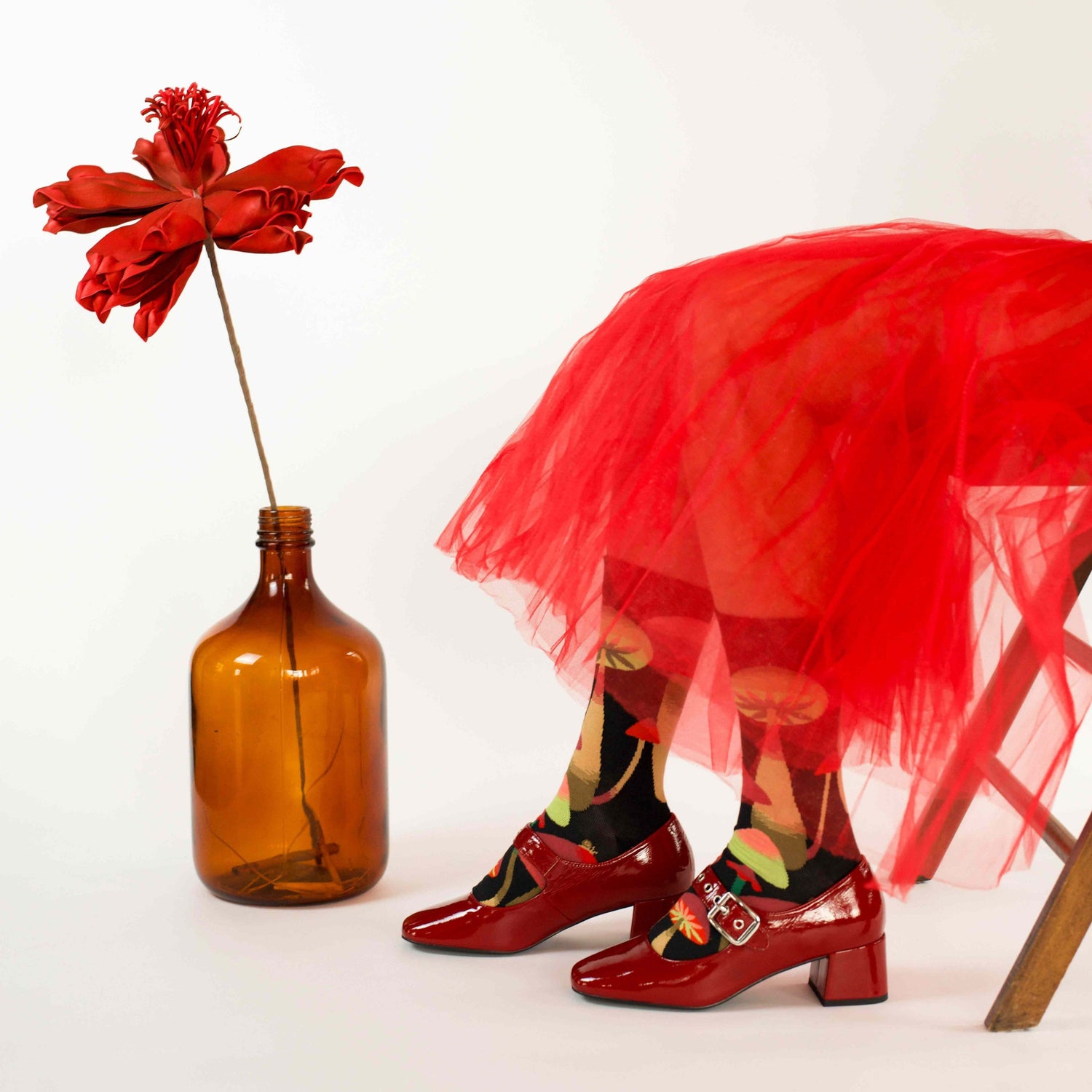 在森林深處,夜幕低垂,燈籠的光芒將黑夜染成一片深紅。空氣中瀰漫著神秘的氣息。我們不禁自問,這些美麗的蘑菇是否有毒?這些蘋果是否被下了詛咒?在紅色光暈中的女人,是否擁有魔法力量?葉子般的手,輕輕地摘下冬青樹上鮮紅的漿果—它們是藥物,還是別有深意?