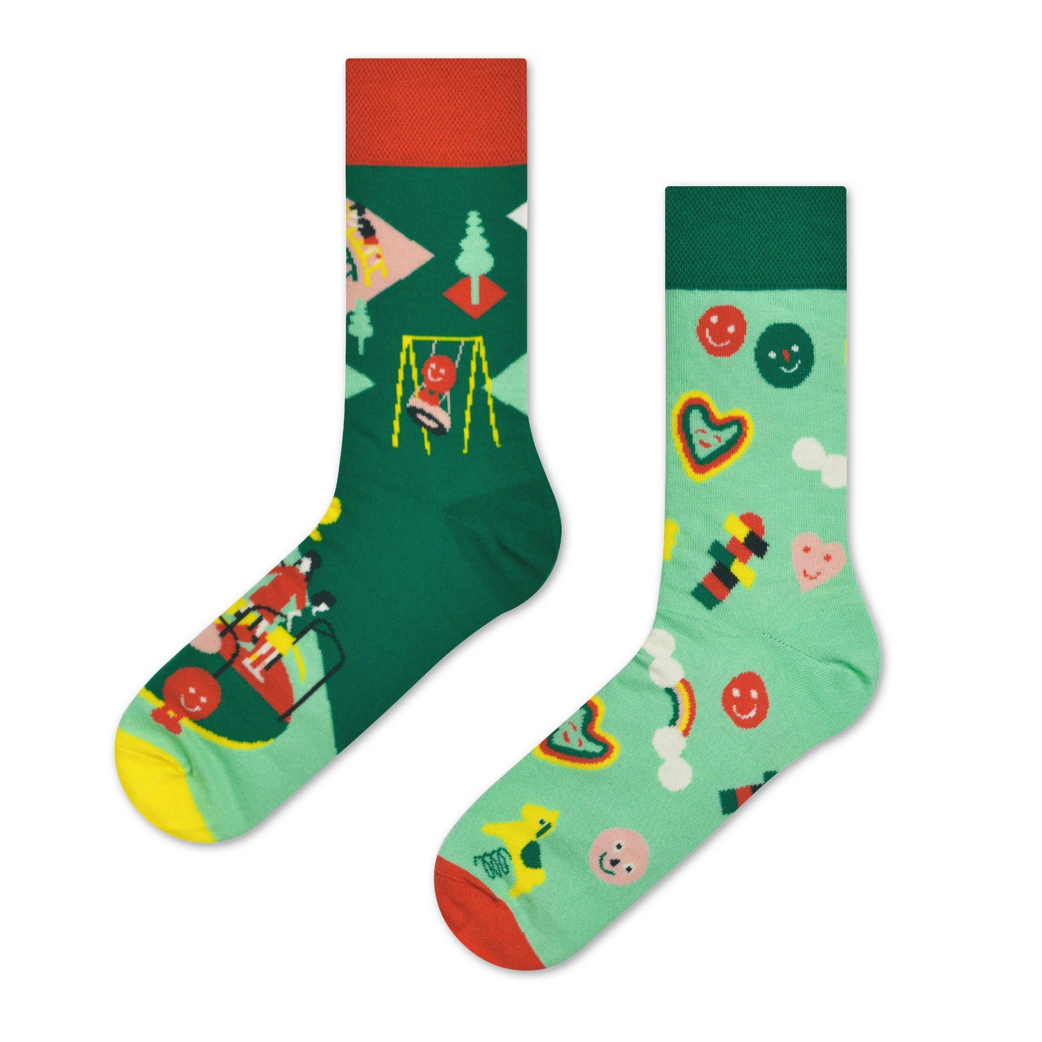 屋邨遊樂場是我們幾代人的集體童年回億,在唐氏綜合症朋友的眼中,這裡則是一個太空遊樂場。滑梯變成了火箭發射台,鞦韆是漂浮在宇宙中的太空船。這款襪子以繽紛圖案,將遊樂場變成了一個探索宇宙的奇幻基地。