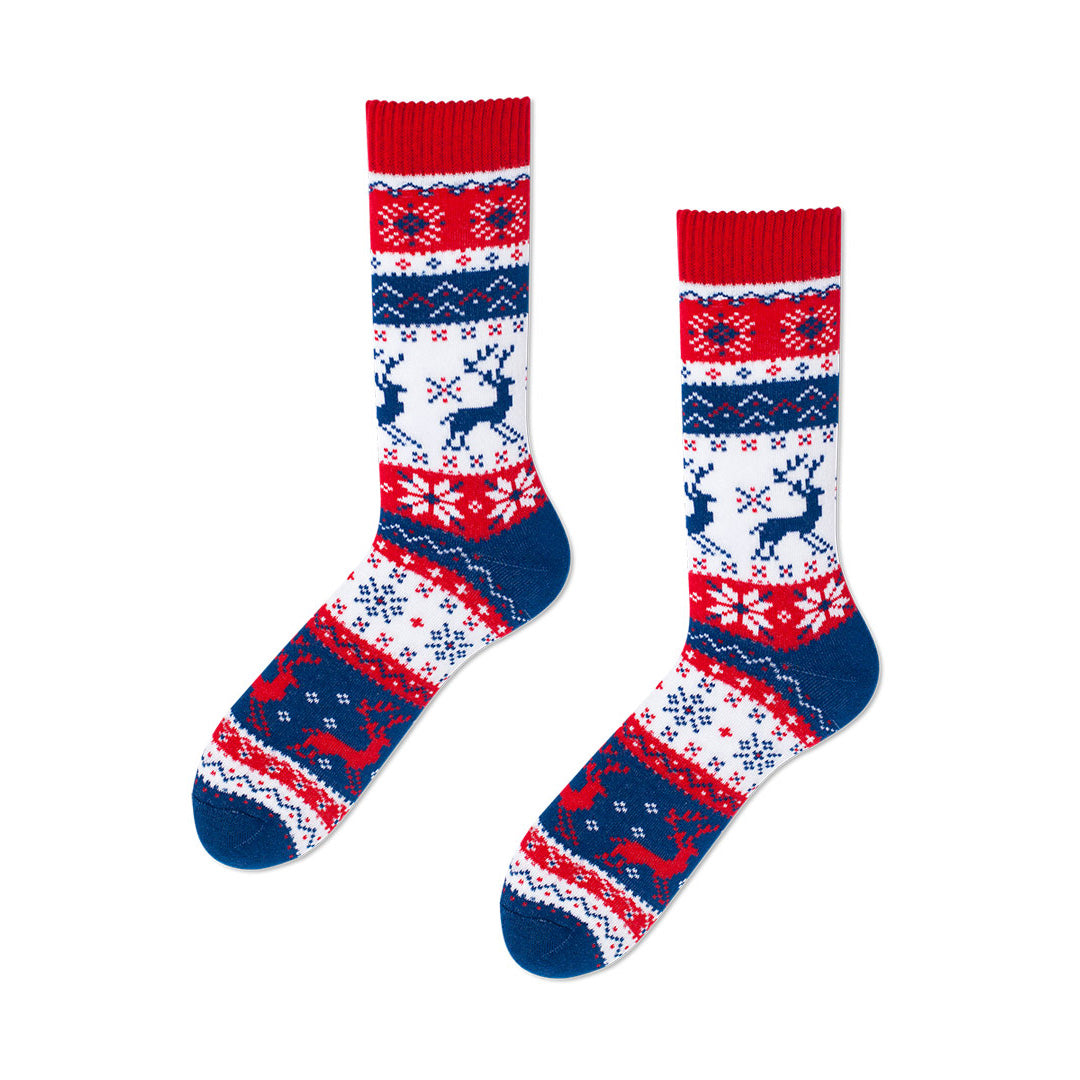 Adult crew socks with red and blue and patterns, with Rudolph as decorative icon.