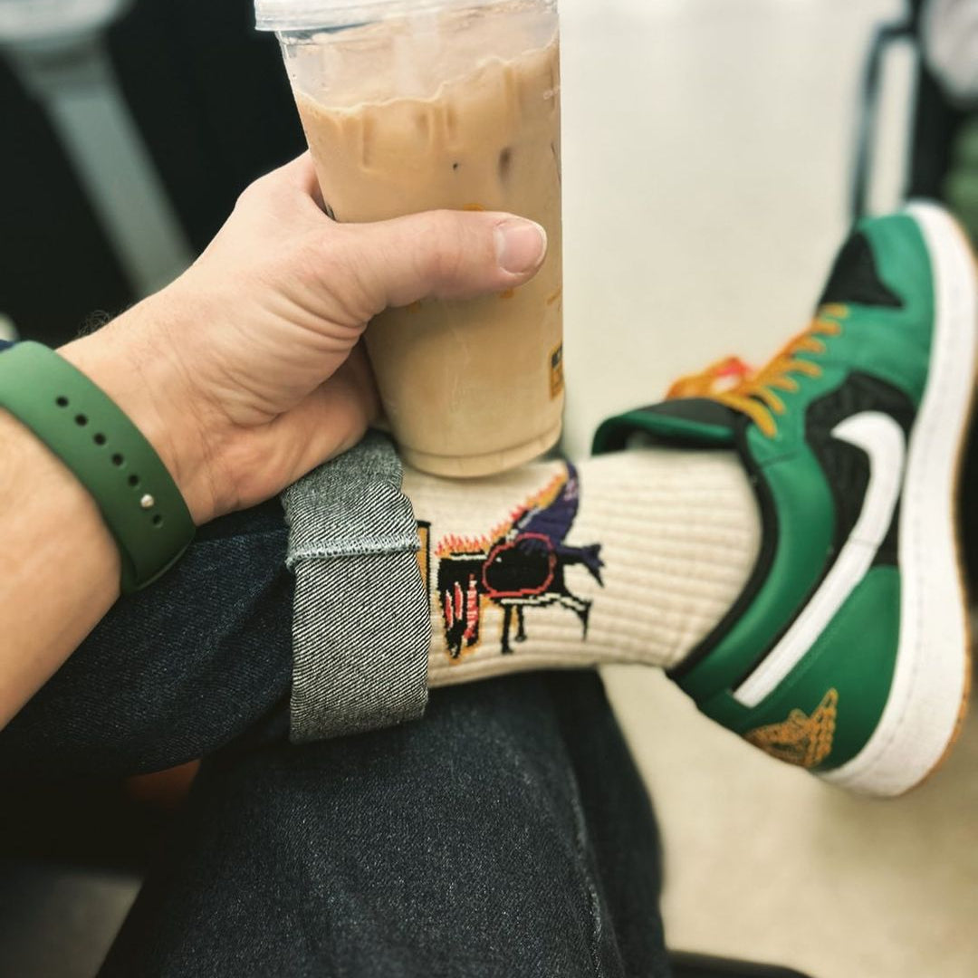 Neo-expressionism takes over your looks this season thanks to one of artistic mastermind, Jean-Michel Basquiat's, most iconic creations. The dinosaur, with its three-pointed crown, will roam freely around your ankles to surprise '80s culture and urban fashion fans. These unisex athletic-style socks are versatile and very comfortable. Say hello to the best accessory to pay homage to this groundbreaking artist!