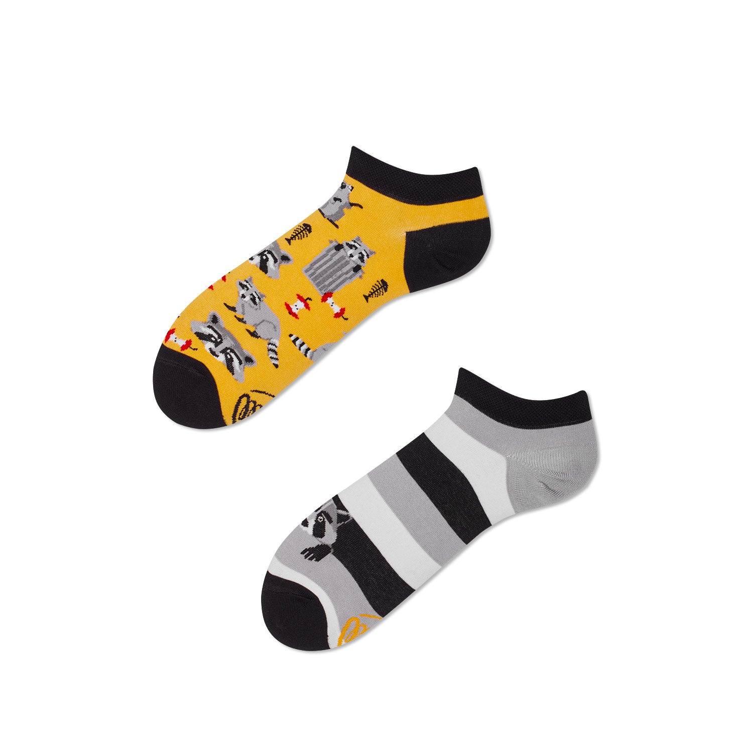 Adult cotton mismatching ankle socks featuring raccoon exploring the trash can and grey stripes on the other sock.