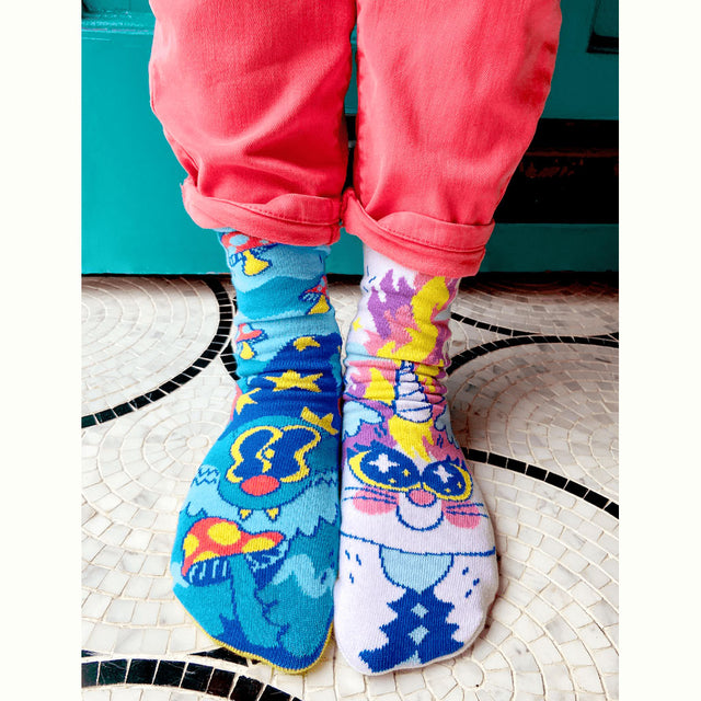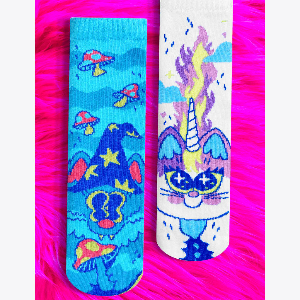 BRAND NEW FOR SPRING! The latest Pals drop is absolutely magical. Meet our newest mystical Pals: Abra the wizard cat & Catabra the caticorn! These maximalist cat socks are 1 of 3 purrfectly mismatched pairs from the limited edition Pinkgabbercat collection by Gabby Kash. These psychedelic besties don't match. It's so much better that way. The best kinda pals are the ones who expose you to all of the good things life has to offer. When you wear these socks, you'll flaunt our maniFEETsto of creating a friendlier, vibrant, more open-minded planet.