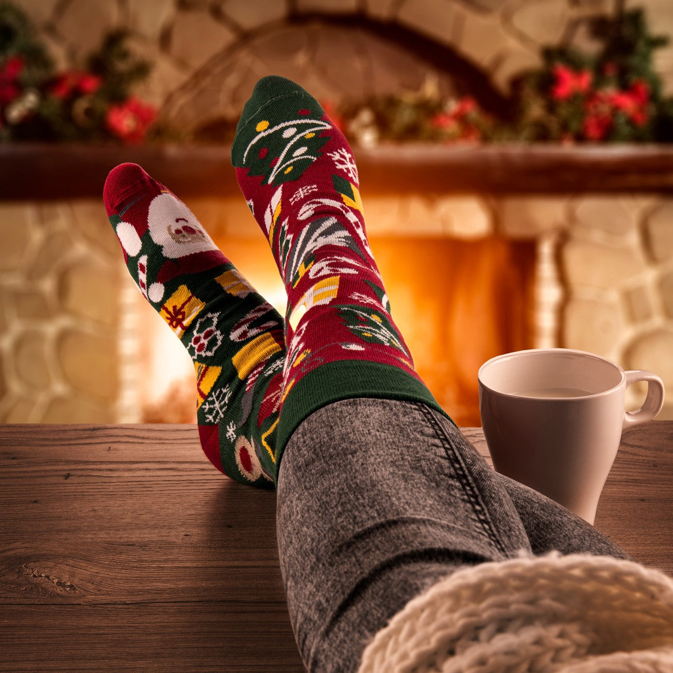 Feeling extra-warm with socks on with your beloved ones around the fireplace, featuring Christmas tree, ornaments, gift boxes and cute reindeer.