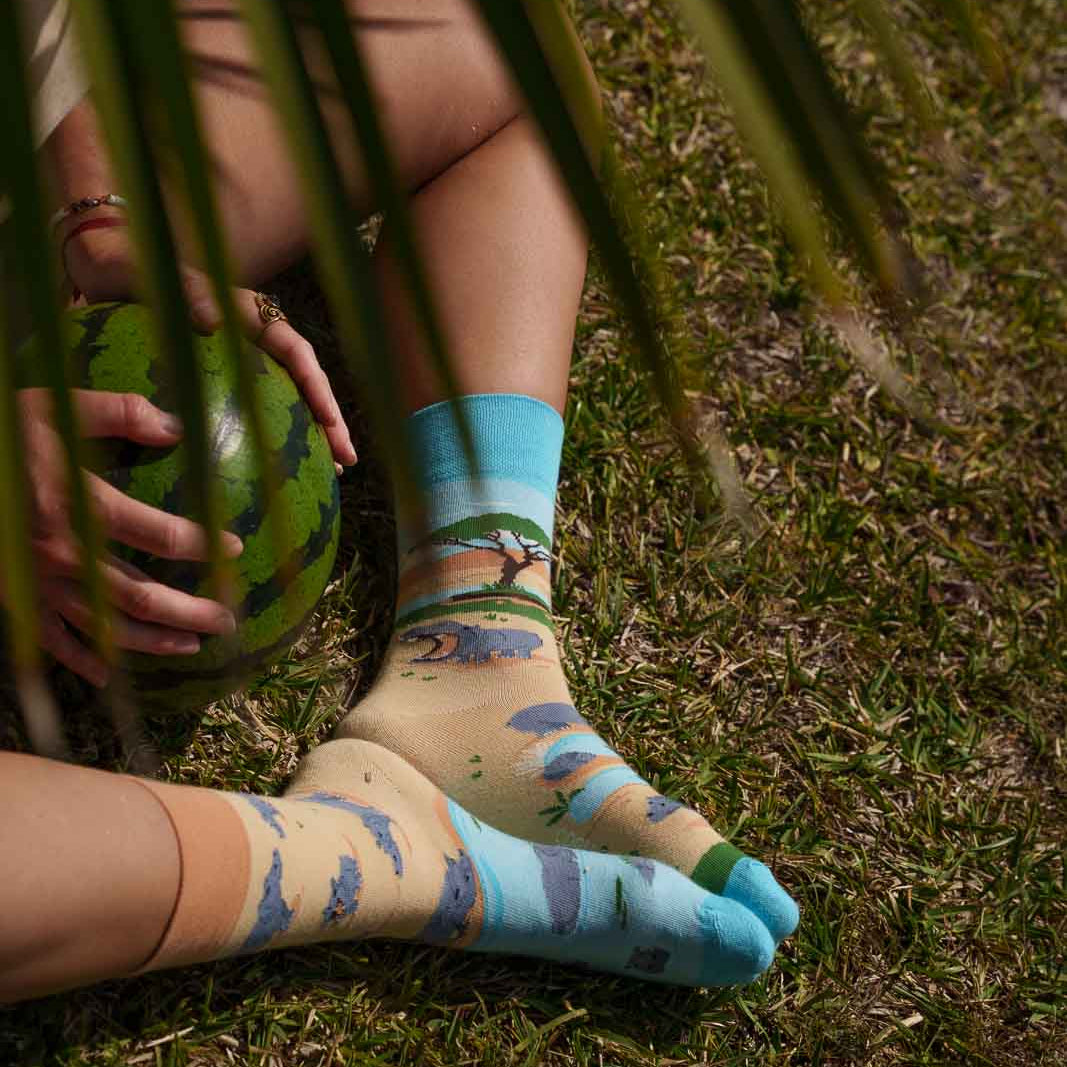 One sock in the pair features a beige background with hippos roaming the savannah—walking, splashing, and even roaring—set against the silhouette of a majestic baobab tree. The other sock brings a refreshing twist, with beige and blue hues showcasing cheerful hippos peeking from the water, lounging on land, and just enjoying their day in the wild.