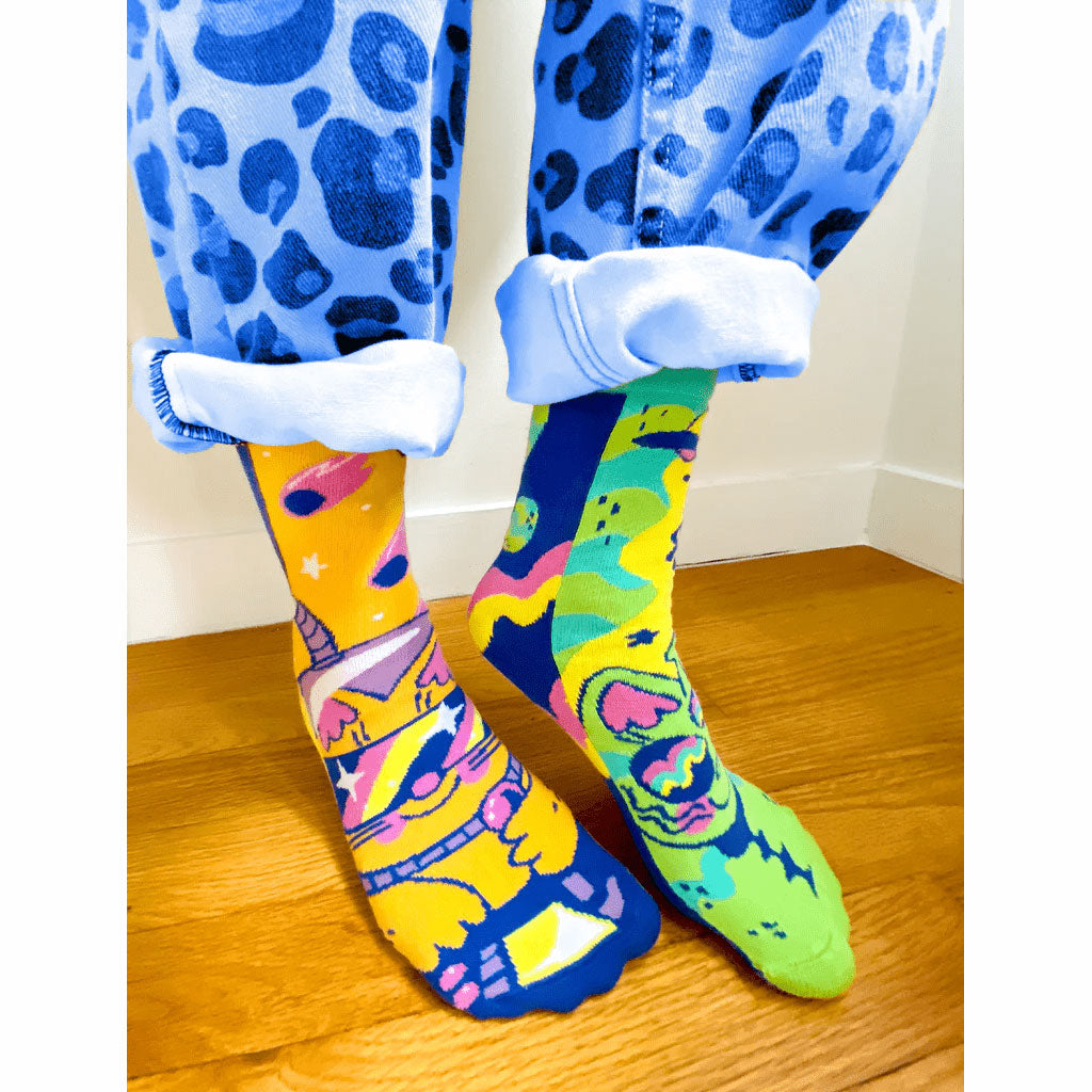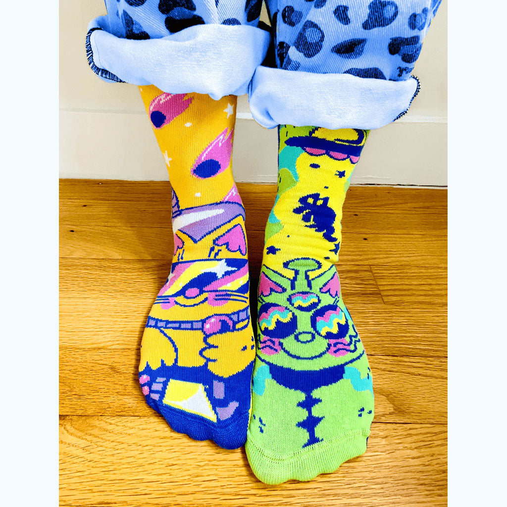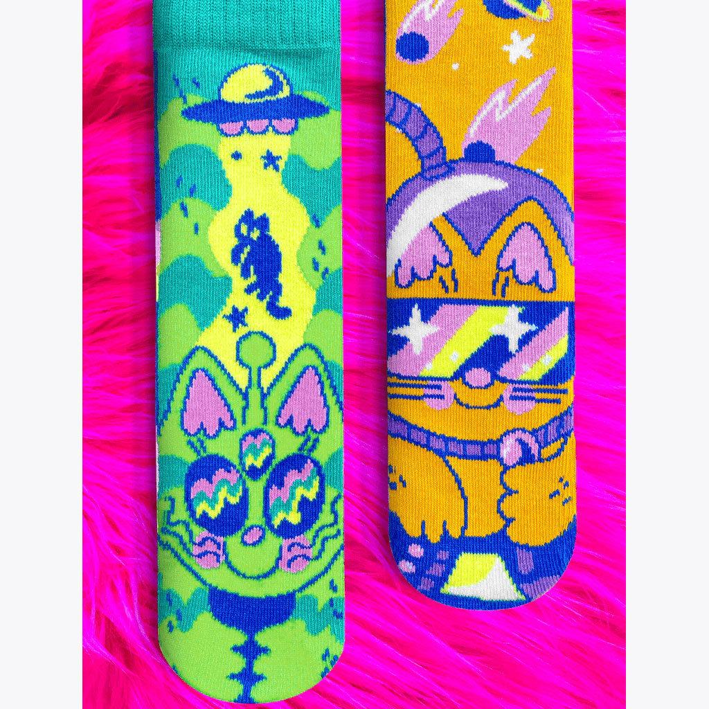 BRAND NEW FOR SPRING! The latest Pals drop is outta this world. Meet extraFURrestrials: Lunar the alien cat and Tick the space cowboy cat! These maximalist cat socks are 1 of 3 purrfectly mismatched pairs from the limited edition Pinkgabbercat collection by Gabby Kash. These psychedelic besties don't match. It's so much better that way. The best kinda pals are the ones who expose you to all of the good things life has to offer. When you wear these socks, you'll flaunt our maniFEETsto of creating a friendlier, vibrant, more open-minded planet.