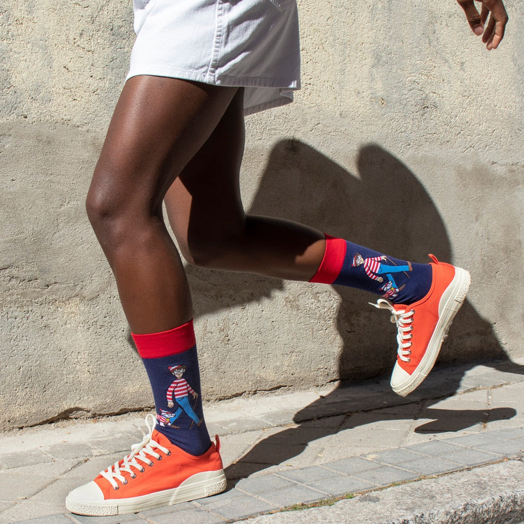 The gang's all here and ready to dive headfirst into a new adventure! Are you in? In this zany design we can see Wally, his pup, Woof, and his pal, Wenda – all matching in Wally's signature red and white striped shirts, cap and glasses. The only thing missing is you! Plus, the dark blue in contrast with the red heel and toe, makes these the most versatile and original socks in your closet. These beloved characters will take a stroll around your ankles, keeping you company and adding a pop of color and whimsy to your day to day. The best part? You'll never get tired of pairing these with your favorite shoes these since each side is different! So don't wait another second! Lose yourself in Wally and friends' craziest adventures... all while wearing these cool socks!