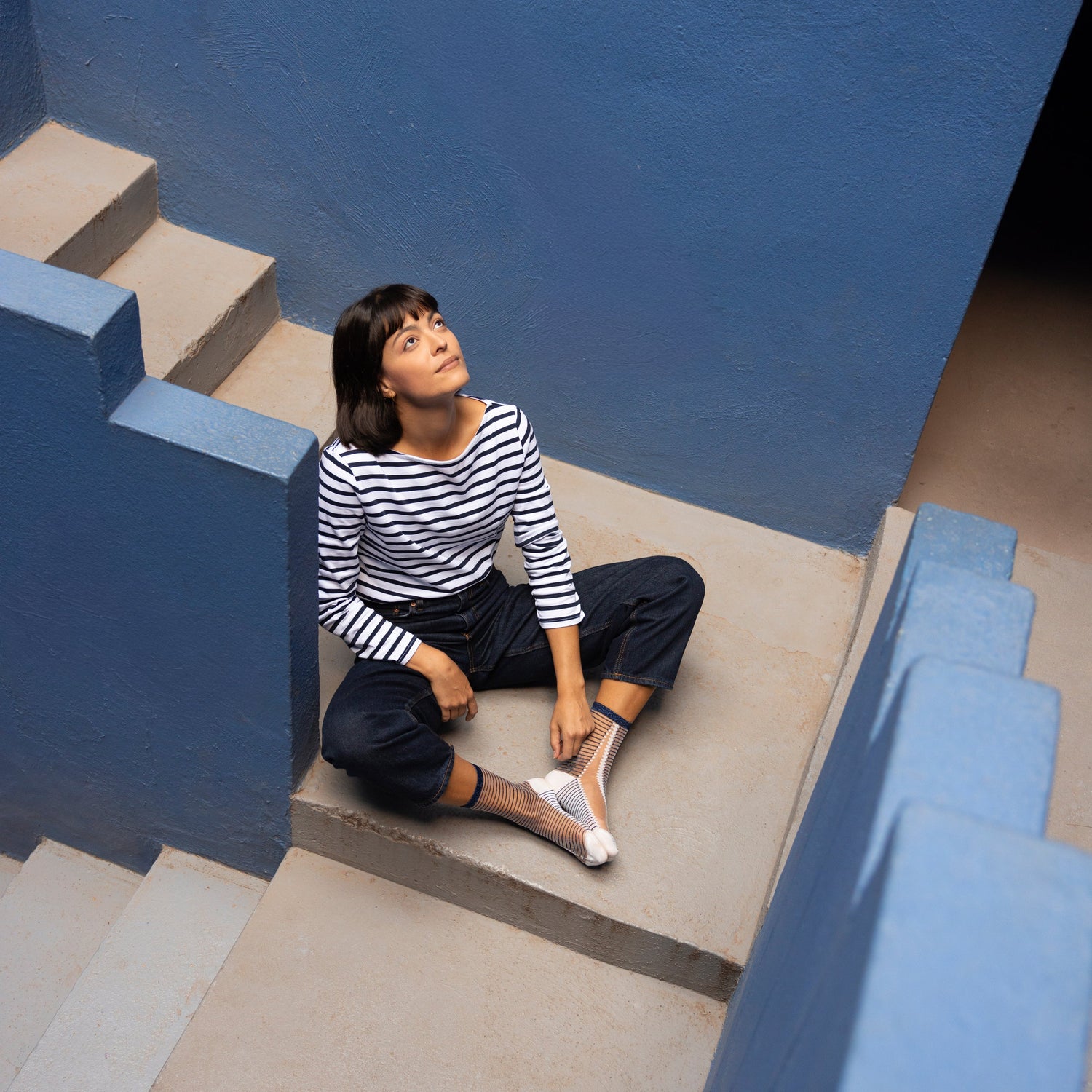 To design the Boavista Blue socks, Violette drew inspiration from Porto's Boavista Avenue, which connects two roundabouts. Its blue and white glittery stripes will pair perfectly with a Breton top and a stylish pair of blue or white sneakers!