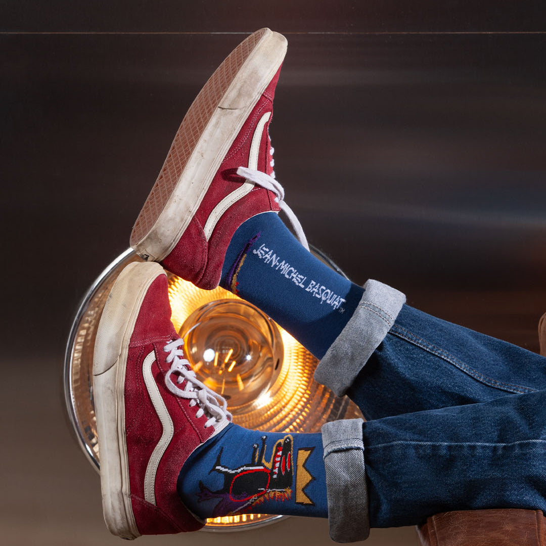 Art and fashion come together in this eye-catching design to celebrate the cultural legacy of the popular artist Jean-Michel Basquiat. His influence, his abstract paintings & his unparalleled use of symbology are on full display in this iconic figure of a dinosaur wearing a three-pointed crown. And that's not all, a work of art in and of itself, you'll be delighted when you find the artist's signature on the inside of the sock. The intense blue of the background in contrast to the colors of the figure, make this design your new go-to!
