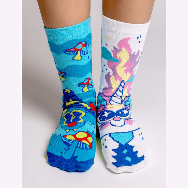 BRAND NEW FOR SPRING! The latest Pals drop is absolutely magical. Meet our newest mystical Pals: Abra the wizard cat & Catabra the caticorn! These maximalist cat socks are 1 of 3 purrfectly mismatched pairs from the limited edition Pinkgabbercat collection by Gabby Kash. Both kids sizes have non-slip silicon grips on the bottom to prevent slipping. Pals are an easy conversation starter, a socio-emotional learning opp. They are visual proof that it is so so much more fun that these besties (and playful "foot puppets") don't match but are still a perfect pair. The best kinda pals are the ones who expose you to all of the good things life has to offer. When a little one wears these socks, they will flaunt our maniFEETsto of creating a friendlier, vibrant, more open-empathetic planet.
