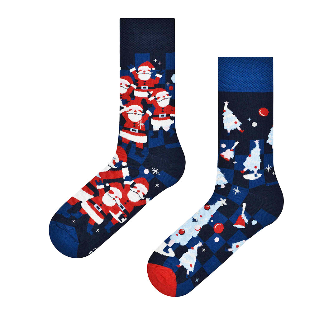 You are cordially invited to the Pair Pair Full’s Christmas party 2024, co-hosted by Santa and Christmas tree! The two main festive characters enjoy a good dance off in the disco, celebrating the happiest moment of the year. Different from past Christmas, this is our first time incorporating glittery silver yarn on our socks, giving even finer sparkling decorative details on the Christmas trees and disco ball. But most importantly, to make sure the party is dazzlingly fun!