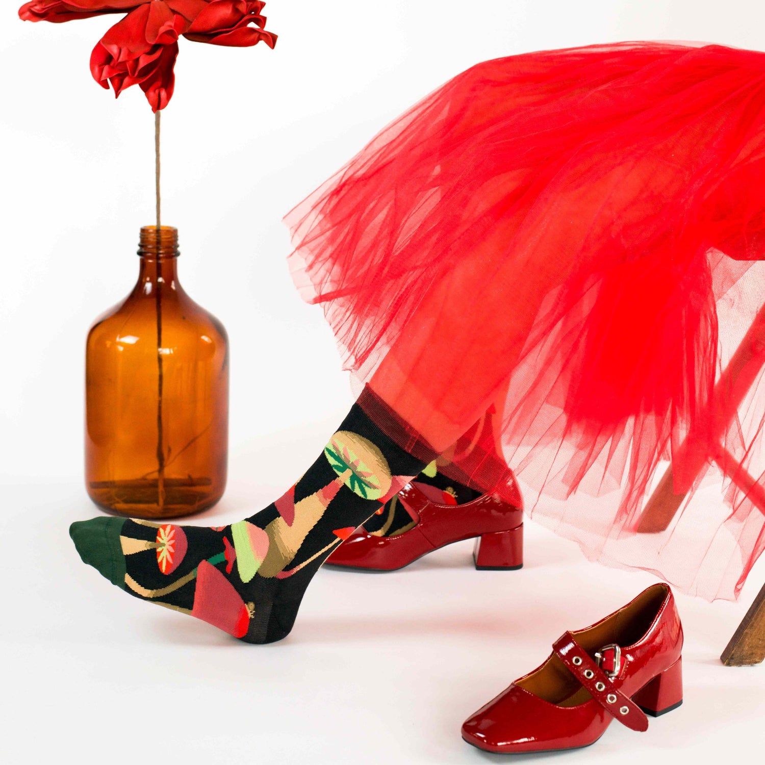 In the heart of the deep forest, night descends, illuminated by lanterns that cast a crimson glow. The air hangs thick with mystery. We wonder, are these beautiful mushrooms poisonous, these apples, are they laced with a curse? The women bathed in the red light, do they possess magical powers? Leaf-like hands pluck the vibrant red berries of the holly—are they a remedy, or something more?