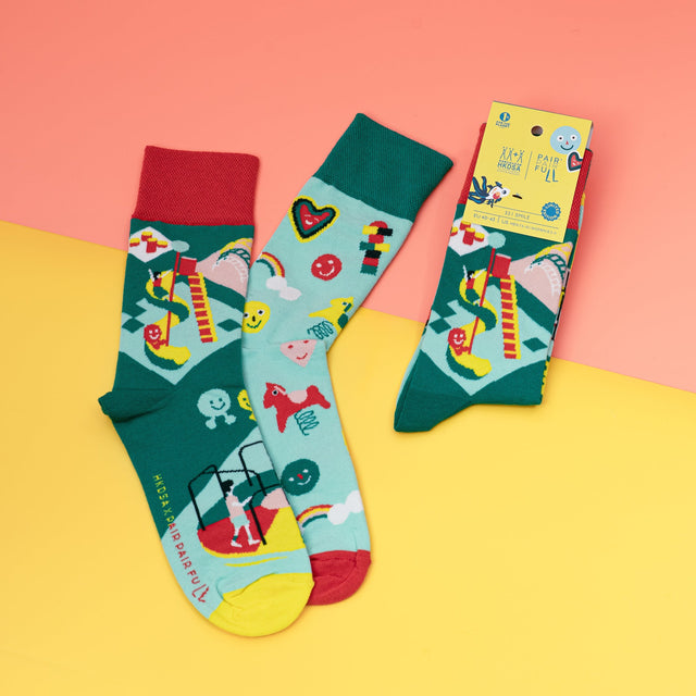 Public housing estate playgrounds are simply our most treasured collective memories across generations. But to individuals with Down Syndrome, these playgrounds are cosmic adventure parks. This sock design features playful planetary motifs, reimagining the playground as a gateway to exploring the cosmos.