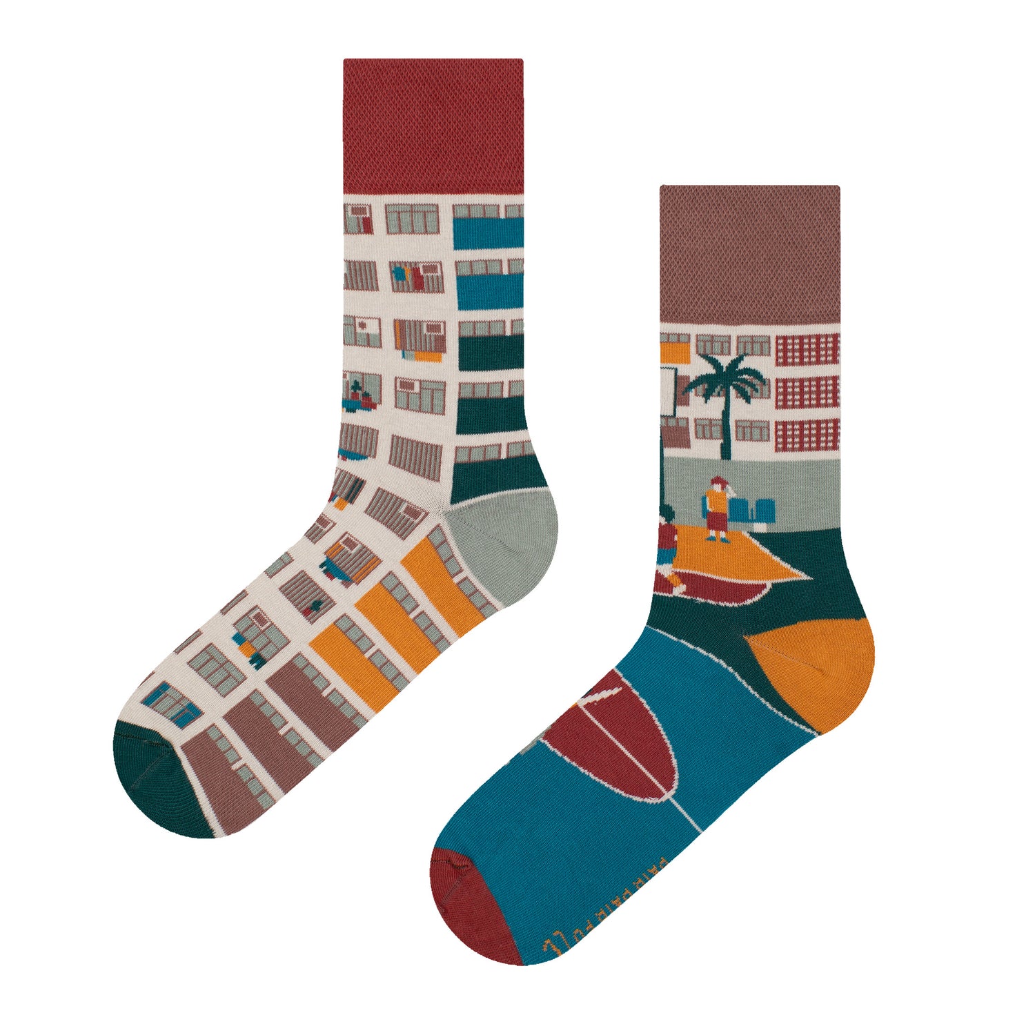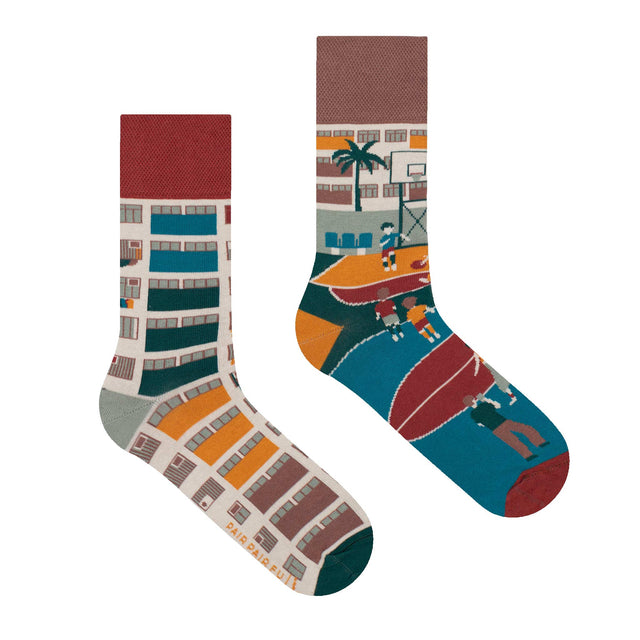 Built in the 60s, Choi Hung Estate (literally means Rainbow Estate) has always been called “the most beautiful housing estate” because of its rainbow-coloured wall. No one knows for sure why there is a rainbow in the middle of the city, some say the estate designer was inspired by the rainbow after the rain above the Victoria Harbour. This is rather romantic isn’t it? These picturesque colourful squares brightened up mundane lives and probably romanticised many first dates. As city redevelopment is on its way, let’s capture the most beautiful memories of the most beautiful estate on the asymmetric socks, and treasure the good old times forever.