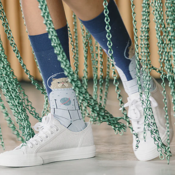 To the moon and beyond with these oh-so-original socks! Complete with a daring AstroKitty, this design takes you deep into outer space.