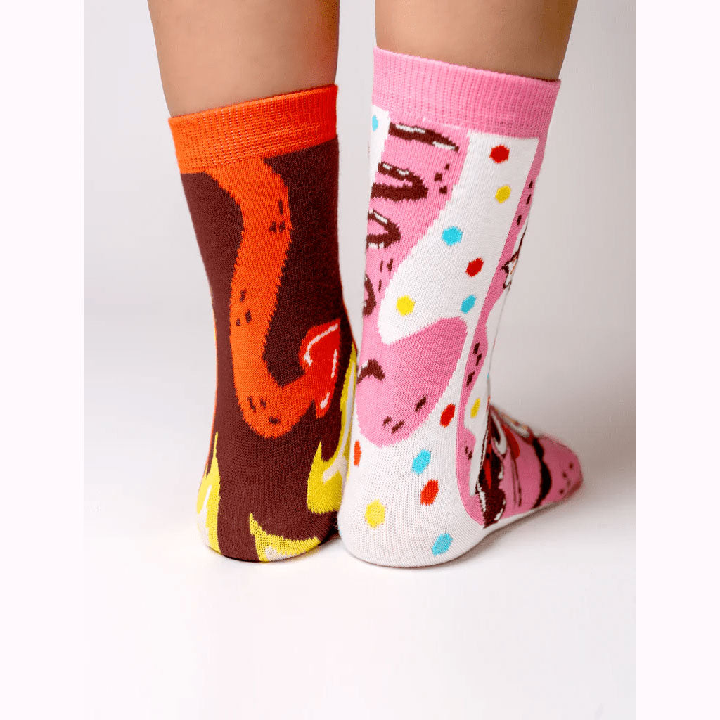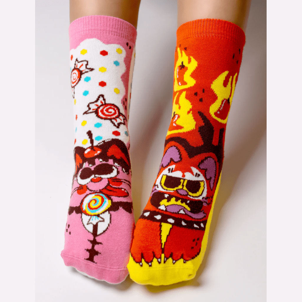 BRAND NEW FOR SPRING! The latest Pals drop is full of delicious catitude. Meet the pawsome pals: Purrty Sweet cat and Feline Spicy cat! These maximalist cat socks are 1 of 3 purrfectly mismatched pairs from the limited edition Pinkgabbercat collection by Gabby Kash. These psychedelic besties don't match. Both kids sizes have non-slip silicon grips on the bottom to prevent slipping. Pals are an easy conversation starter, a socio-emotional learning opp. They are visual proof that it is so so much more fun that these besties (and playful "foot puppets") don't match but are still a perfect pair. The best kinda pals are the ones who expose you to all of the good things life has to offer. When a little one wears these socks, they will flaunt our maniFEETsto of creating a friendlier, vibrant, more open-empathetic planet.